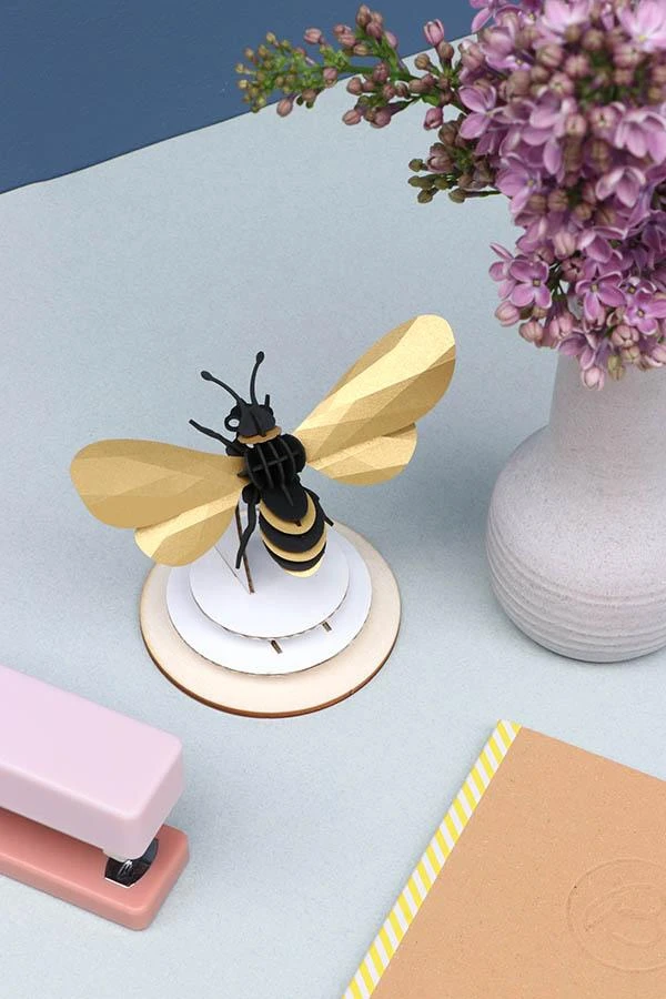 Dieses 3D-Puzzle-Kit enthält alle Teile, um die Papierbiene kleberfrei zusammenzubauen. Der Bienenkörper besteht aus schwarzem Karton. Die Flügel sind aus goldenem Metallic- Papier.